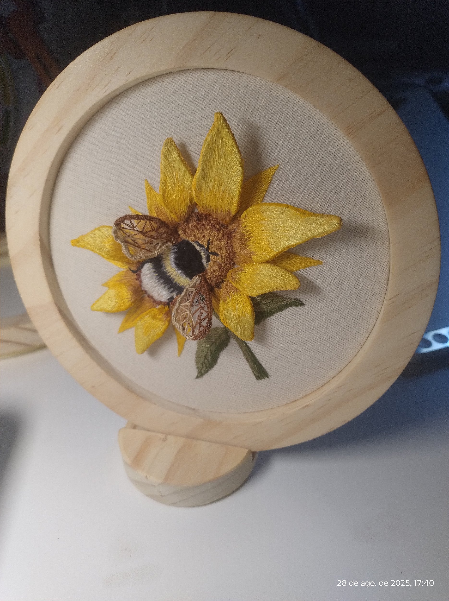 Este bordado 3D exclusivo simula a textura das asas da abelha e as pétalas do girassol.