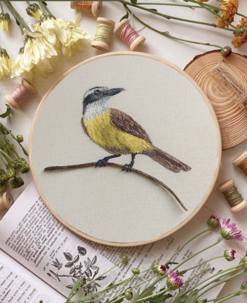 Peça exclusiva bordada a mão com a técnica de pintura de agulha que imita a textura das penas